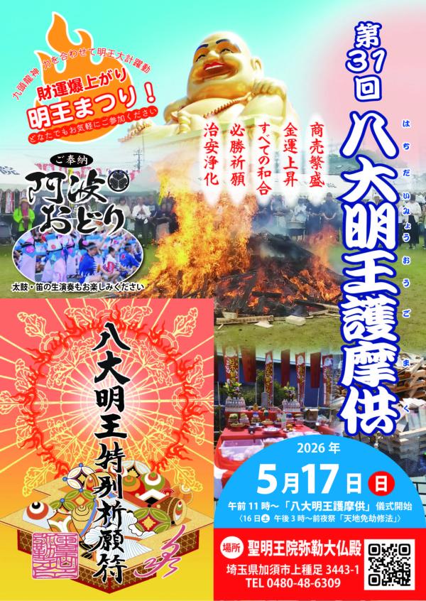 5月17日(日)、聖明王院弥勒大仏殿(埼玉県加須市上種足)にて、「八大明王護摩供」が行なわれます。