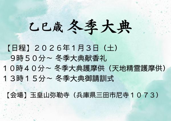 1月3日、玉皇山弥勒寺(兵庫県三田市尼寺)にて、「乙巳歳 冬季大典」が行なわれます。